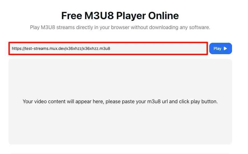 Öncelikle geçerli bir M3U8 linki hazırlamanız gerekir (canlı yayın veya isteğe bağlı video M3U8 adresi gibi). Geçici olarak kendi linkiniz yoksa, araç tarafından sağlanan test linklerini deneyebilirsiniz: